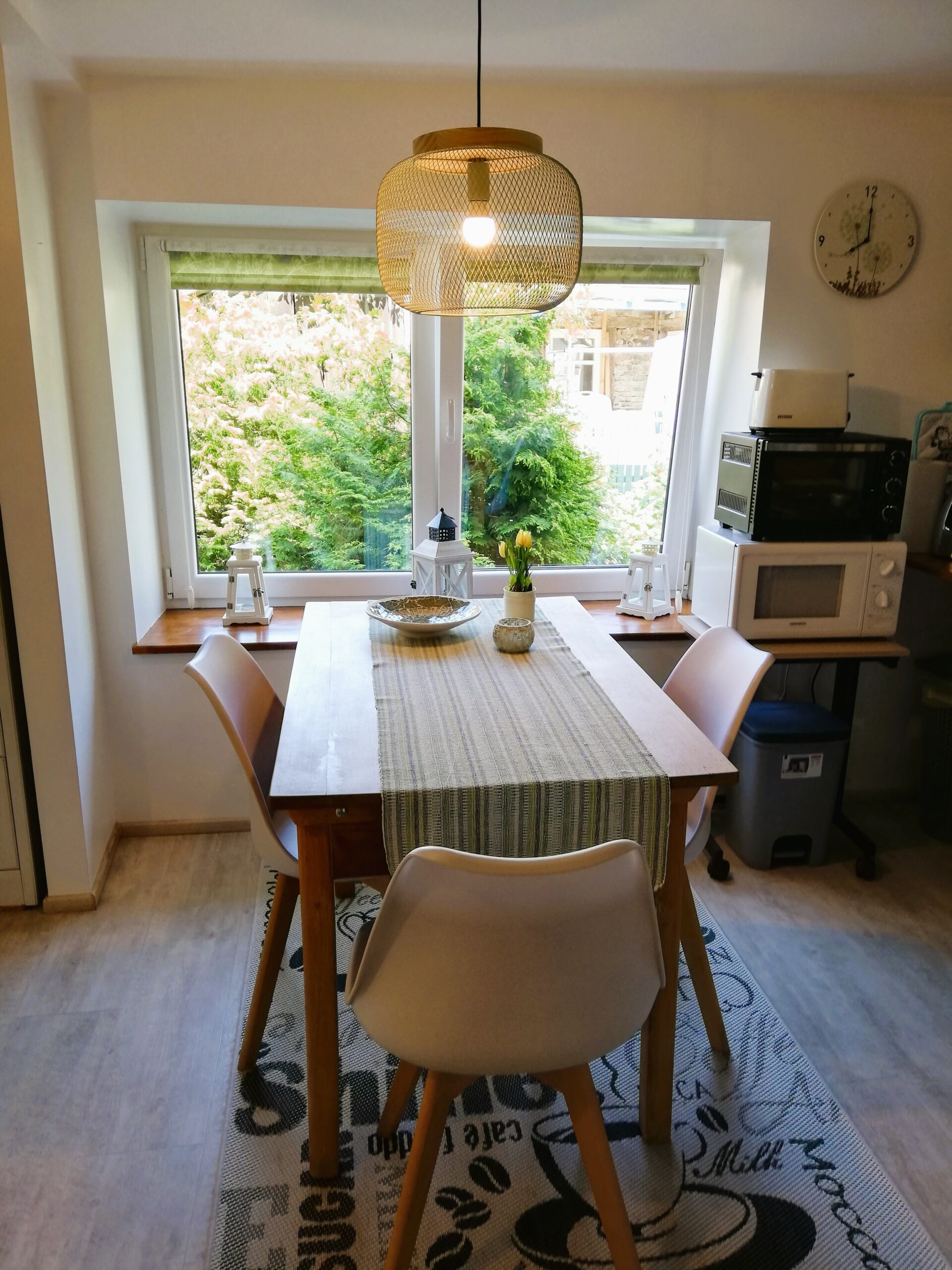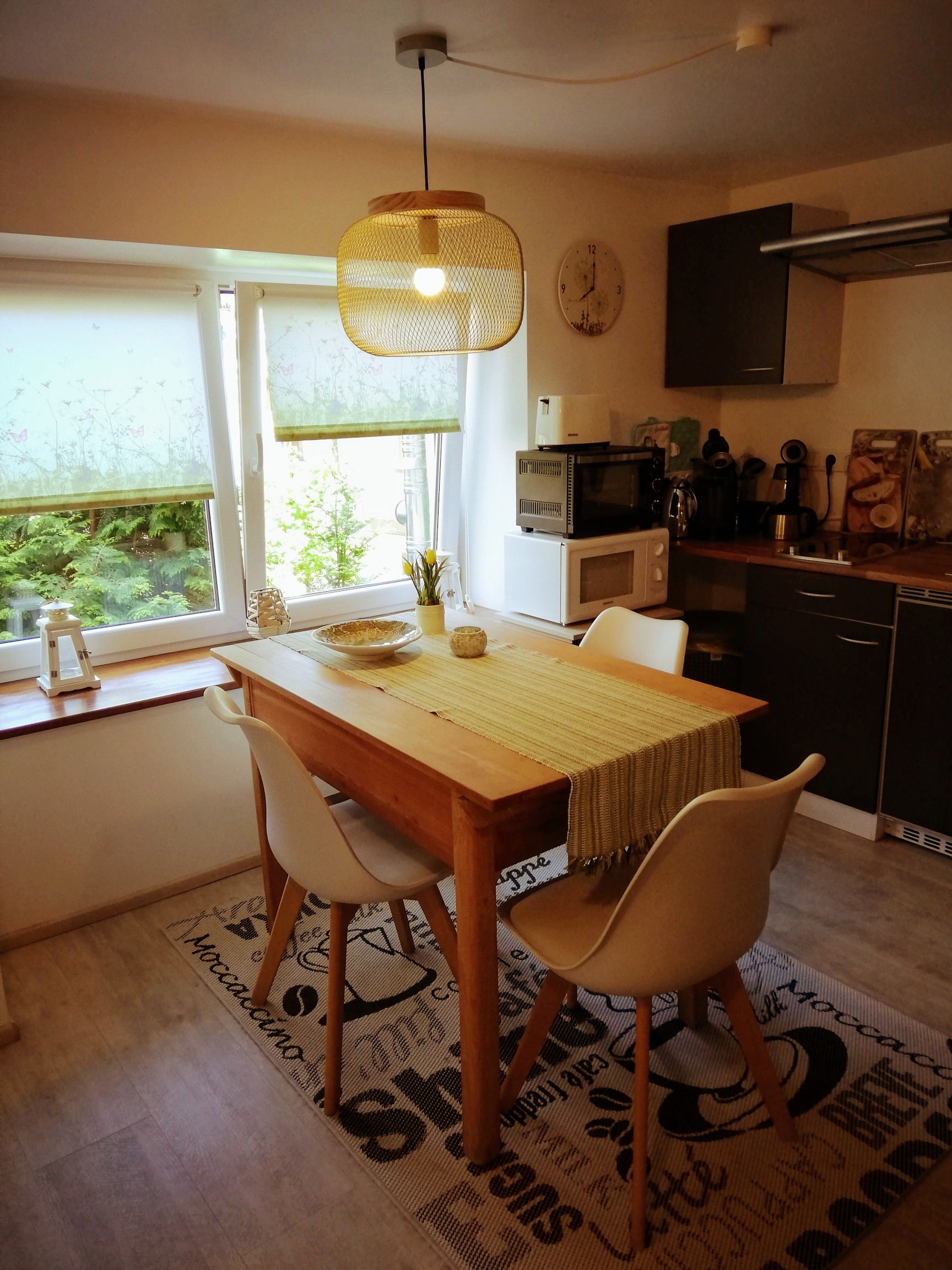 An unserem gemütlichen Esstisch finden 4 Personen Platz und in unserer Küche findet man eine gute Grundausstattung zum Kochen.